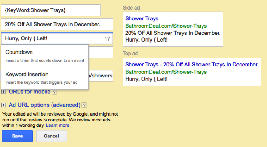 Adwords have made setting up these ads really easy now. All you now have to do is write your advert as normal and where you’d like the ads to feature the countdown aspect simply key ‘{‘ and the option to use countdown or keyword insertion will appear.